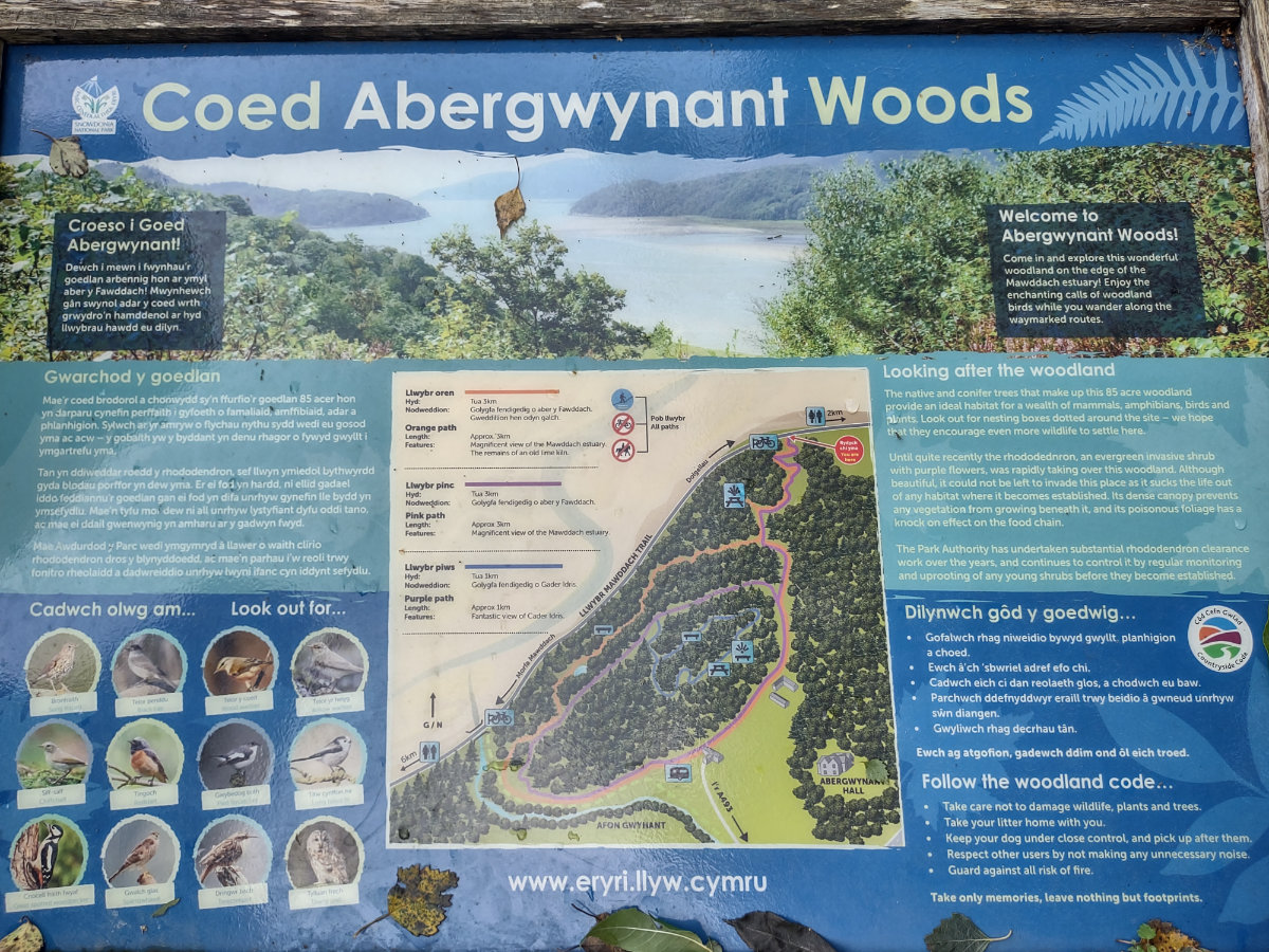 As I'm sure you have gathered from the title, our target today is Coed Abergwynant's Purple Path (it looks blue on some signage but it is labelled purple, so that is what I'll go with), this walk is actually a small loop off of the Pink Path, so we will be following the pink arrows for quite some time before diverting onto the Purple Path loop, then retracing the Pink Path back to the entrance. We opted for this route as it will cover the two viewpoints promised by the map at the entrance, which are the main draws for us - if you are looking to tackle longer walks then following the Orange Path or Pink Path to the end may be more your thing, but we can highly recommend shooting for the Purple Path. Of course, these walks are interlinked and circular, so they are very easy to tack onto one another for a grand adventure. It is also worth noting that we visited on an unseasonably wet September morning and so everywhere was muddy, we can't be certain what this woodland would look like under normal conditions, but I would always plan for a woodland walk like this to be at least a little muddy. That being said, even under less-than-ideal conditions we were always able to pick our route through the quagmires in our hiking boots, so hopefully you won't face too much adversity no matter when you choose to visit.